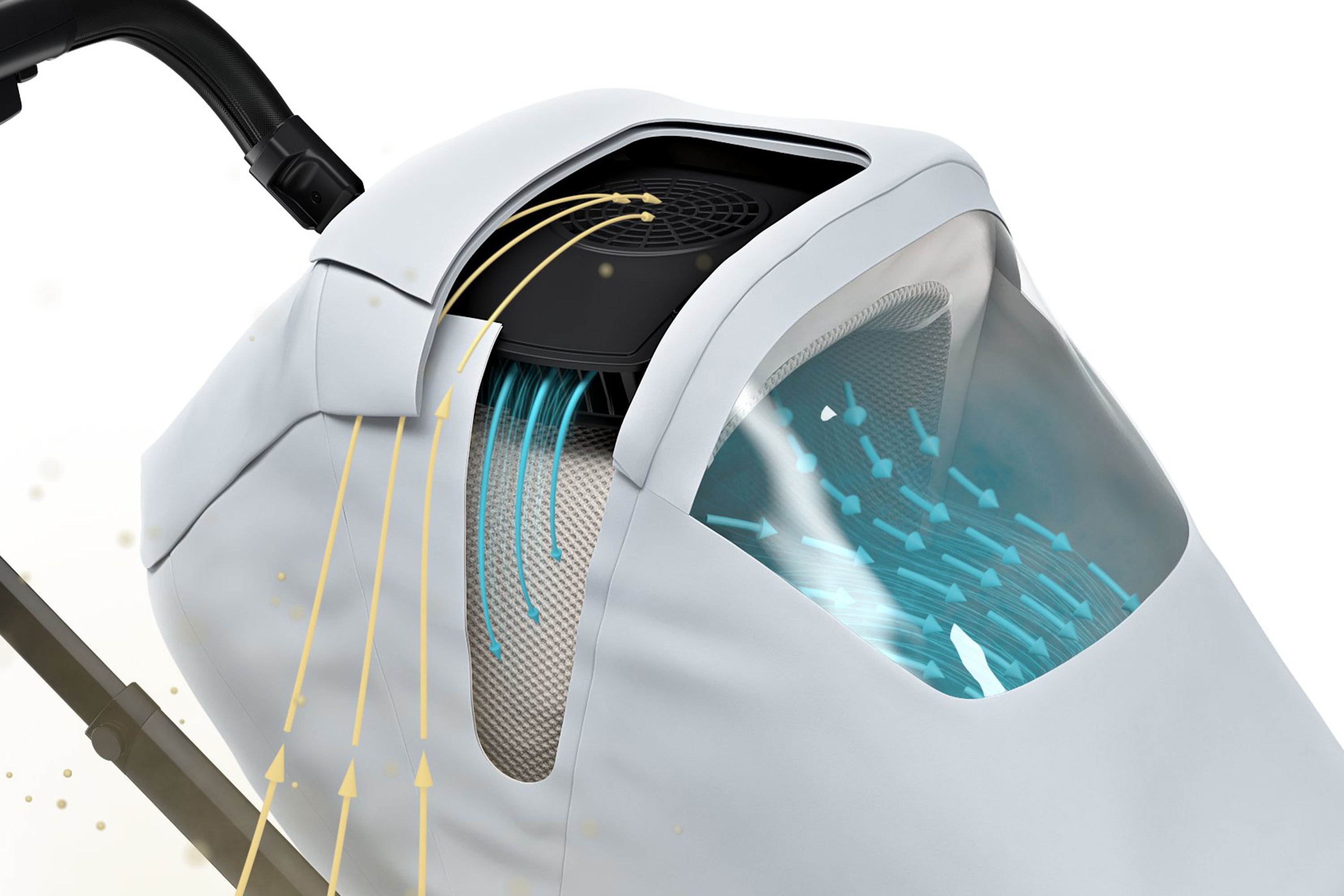 A fan located at the back of the canopy draws in air, filters it, and then gently pushes it into the bassinet or stroller. The highly efficient EPA filter captures 98% of harmful polluting particles, as well as viruses, bacteria, and pollen. This ensures the air that enters the stroller and surrounds your child is clean and purified