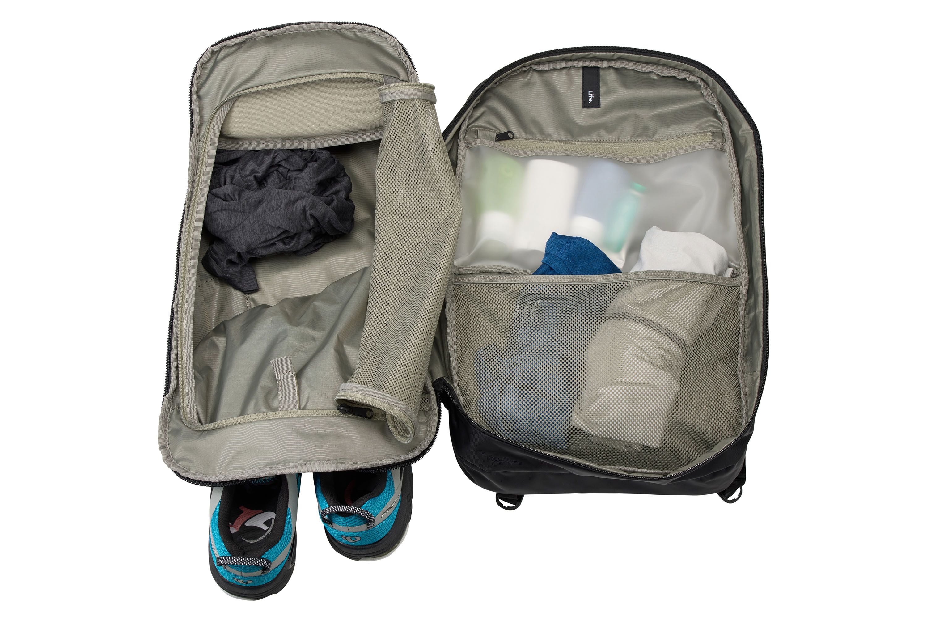 Monikäyttöinen urheilureppu, joka muuntuu nopeasti ulkoilurepusta työrepuksi erillisten osastojen ansiosta.