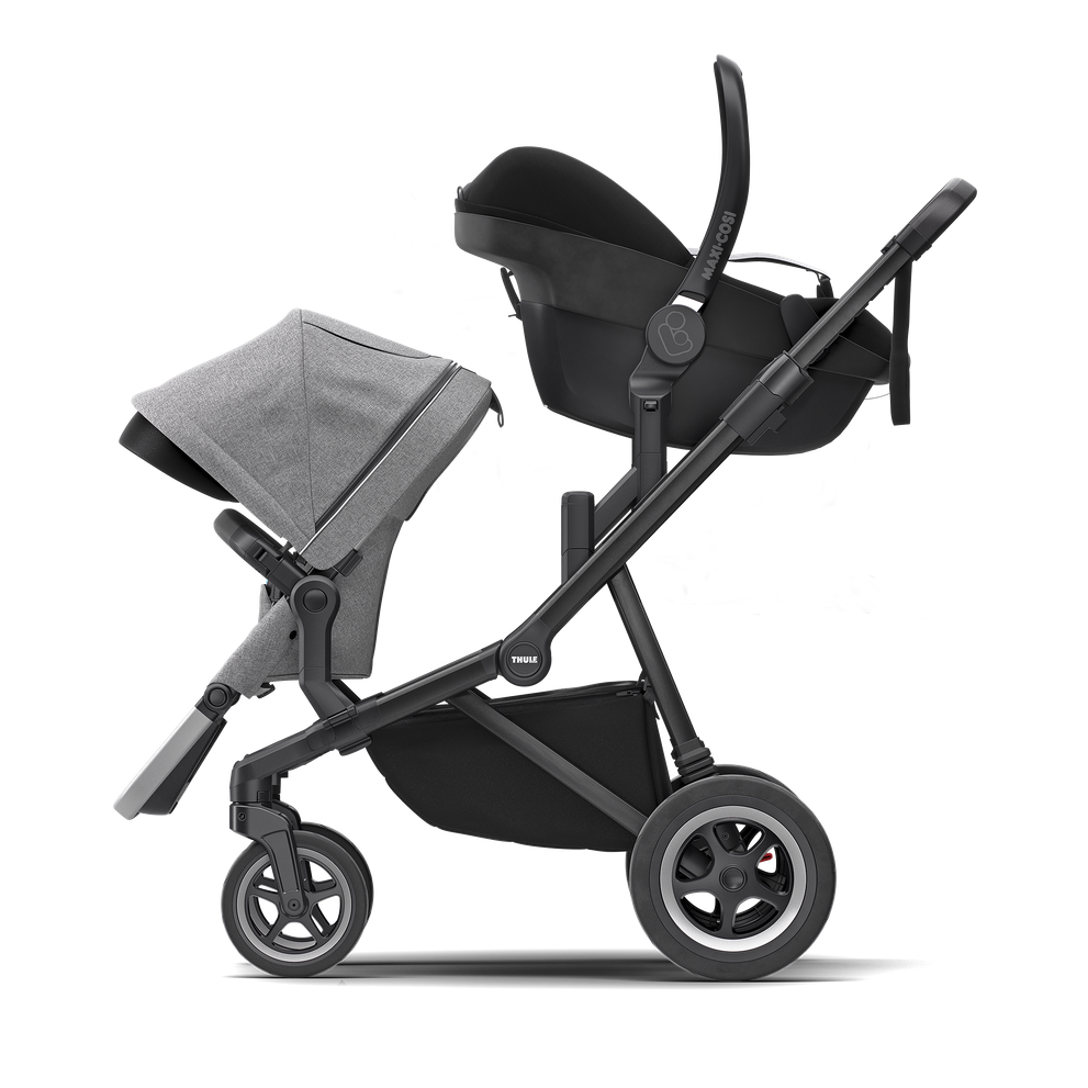Siirtyminen autosta rattaisiin sujuu käden käänteessä, sillä sovittimen avulla voit kiinnittää turvakaukalon nopeasti ja helposti Thule Sleek ‑rattaisiin.
